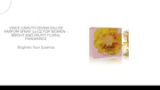 Introducing Vince Camuto Divina Eau De Parfum Spray 3.4 oz for Women - a dazzling fragrance that embodies the essence of femininity with its bright and fruity floral notes. This enchanting perfume opens with a burst of energizing grapefruit and sweet, soft mimosa, creating a joyful and refreshing scent that uplifts your spirit. At its heart, subtle sunflower adds a unique herbal touch that makes this fragrance utterly irresistible.